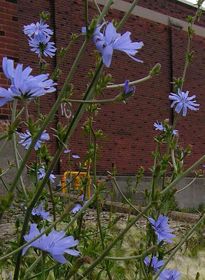 today about serious use of invasive and otherwise normaly uncultivated plants for cooking. Linda Hezel supplies several trendy restaurants in Kansas City with "bedstraw, chickweed, henbit, dandelion, wild bergamot, red clover, dead nettle, lambs-quarters, wood sorrel, purslane, plantain (the leafy variety, not the banana)" as well as chicory (see photo taken here in Montreal.)She grows them on her organic farm, not far from the center of the Midwestern town, but apparently at least one other farm outside New York City also provides experimenting chefs.