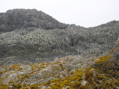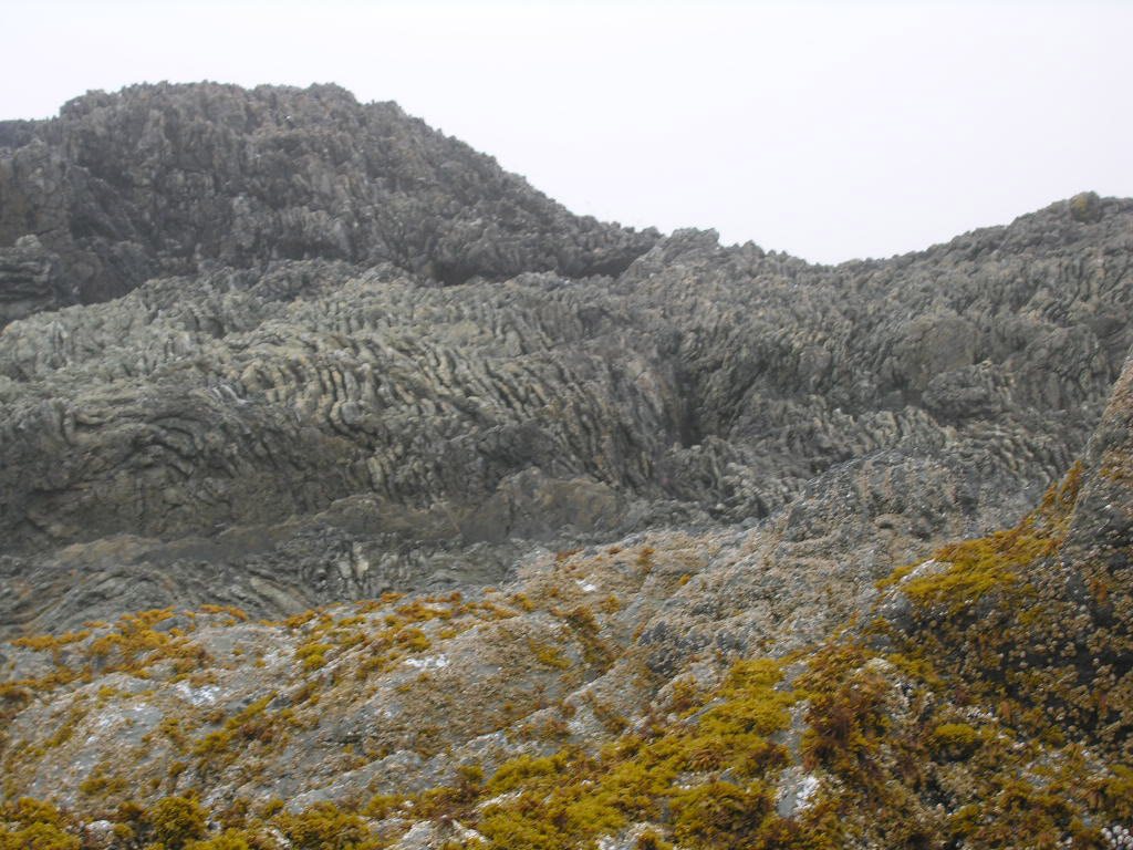 The photo, BTW shows a graphic juxtaposition of time scales: the deformed sedimentary rock that dates from millions of years ago and the kelp that is covered and uncovered by the tides twice a day.