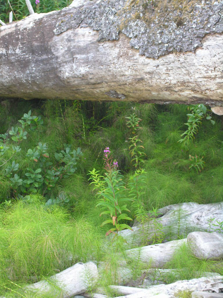 This assembly we found on Willowbrae Beach at the Southern end of Pacific Rim National Park on Vancouver Island. The tide was just beginning to rise and we could walk a long way out on the beach. At the edge of beach, fireweed was growing amid ferns: a love sight.