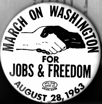 Yesterday I wore the button I got 50 years ago at the March on Wshington for Jobs and Freedom. It elicited only three comments, which surprised me.Either people on the Metro etc. had no idea what it was or were too polite to ask, or I'm invisible.