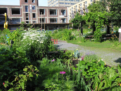 Urban farming is alive and well in Montreal. This community garden was once space the city didn't need any more for its yards, and so was saved from sale and development by being transformed in productive green space.The neighborhood once was industrial, but is being steadily gentrified. That's an old factory that's being turned in condos in the background. Nice to see the change being accompanied by an increase in interest in gardening.