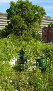 I've been delighted to follow the increasing number of people who seem to be finding corners of the city to garden in. These two photos were taken in les Champs de possible, a formerly abandoned maintenance yard owned by the city of Montreal. The word "formerly" is used advisedly because while the city has recently agreed to let the field stay as it is, it has a stalwart group of admirers. Early I posted photos of the bees at work in it, and now here are two small garden plots that volunteers have begun.