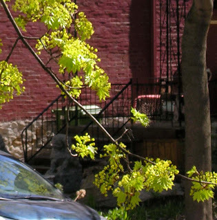 Here are two pictures of the same branch, one taken on Tuesday, and the other on Thursday, to give you some idea. Does the heart good to see the green festoon the trees.