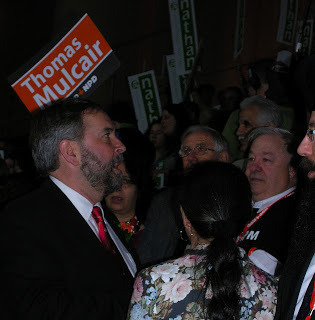 The picture was taken a year ago when we all were waiting for the results of the balloting during the NDP leadership convention. Our man Tom Mulcair has done a great job since then as Leader of the Official Opposition.Can't wait until we can elect him Prime Minister. BTW, the flip side of the banner in the picture was "TM4PM"as was the hashtag for twitters during the convention.
