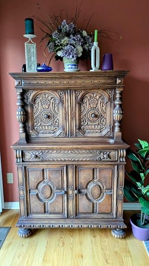 Antique Furniture, Hidden StoriesMy fondness for pre-owned goods continues. I love browsing estate sales, vintage markets, and Facebook Marketplace, where treasures often come with untold stories. One of my favorite finds is a heavily carved piece that reminds me of something King Arthur himself might have owned.