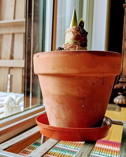 Bonus pictures!Wanting to cheer those inundated with snow this week, I took a picture of sun streaming through my red vases. And then I noticed, to the left of center, the first sign of growth on my amaryllis bulb. I love to grow this amazing flower in the dead of winter as a reminder of hope for spring. Stay warm!
