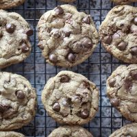Using a 2 1/2-inch ice cream scoop, place six large mounded scoops of cookie dough in each pan. Press the extra morsels and some of the sprinkles on the surface of the dough, but keep the dough mounded when placing pans in the oven. Bake for 18-20 minutes.