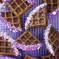 Before the chocolate melts, cover the edges with sprinkles. Sprinkle them over a large bowl so you can reuse any leftover. Lay waffle wedge on a wax paper covered surface and drizzle with more chocolate. Let dry and they’re ready for their close up.