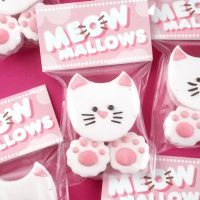 Decorate paws and faces with a toothpick dipped in melted pink and chocolate candy coating. Package in treat bags with Meowmallow tags.
