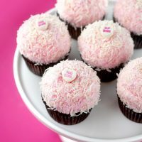 To decorate: Fill decorator bag fitted with a large round tip with fluff frosting. Pipe swirls on top of cupcakes and then gently press sides and top into a bowl filled with unsweetened coconut. Use palm of your hand to help shape round tops if needed. Top with Valentine’s Day candy hearts if desired.