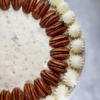 Note: Before mixing chopped pecans in all of my frosting, I set some off to the side to pipe on top of the cake. I also added some extra chopped pecans around the base of the cake…