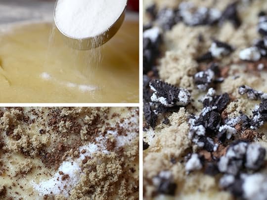 The rolled dough is covered in melted butter, cocoa, granulated sugar, brown sugar and crumbled Oreo cookies.