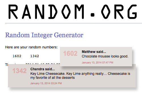 Hey guys! It’s time to announce the cheesecake winners. Their cheesecakes of choice were Chocolate Mousse and Key Lime. So that means you Matthew and you too, Chandra! Congratulations!!! I hope you enjoy.