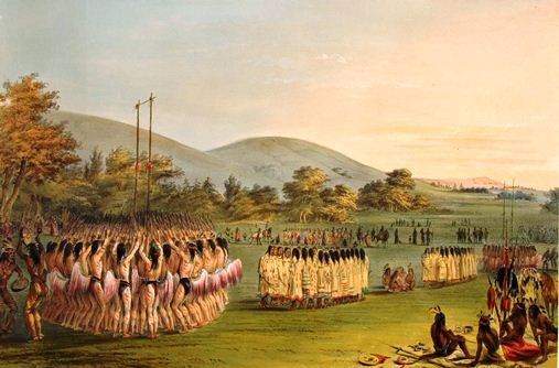 பூர்குடிகள் ஒன்றுகூடி செய்யும் சடங்குகளைச் சித்தரிக்கும் ஓவியத்தில் வெளிப்படும் வண்ணமும் தோற்றங்களின் சேர்ந்தியக்கமும் அபாரமாக வரையப்பட்டுள்ளன. பெண்களையும் குழந்தைகளையும் கேட்லின் அதிகம் வரையவில்லை.