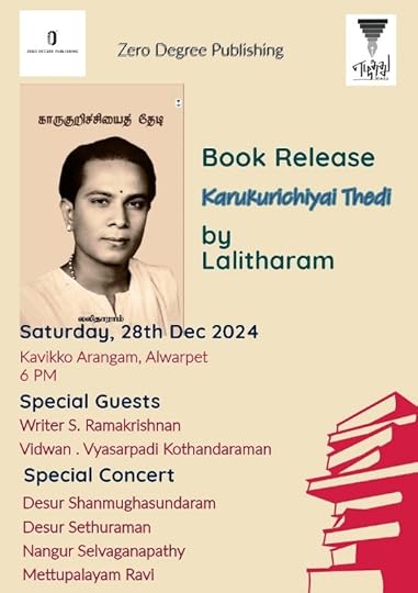 நாதஸ்வர மேதை காருகுறிச்சி அருணாசலம் குறித்து இசைவிமர்சகர், ஆய்வாளர் லலிதா ராம் எழுதிய காருகுறிச்சியைத் தேடி நூலின் வெளியீட்டு விழா நாளை மாலை நடைபெறுகிறது. ( டிசம்பர் 28 ).