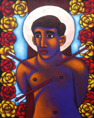 Saint Sebastian is a favorite subject of contemporary gay artist Tony De Carlo, whose work is at the top of this post. He began his ongoing Sebastian series in the 1980s in response to the AIDS crisis. It has grown to more than 40 pictures.