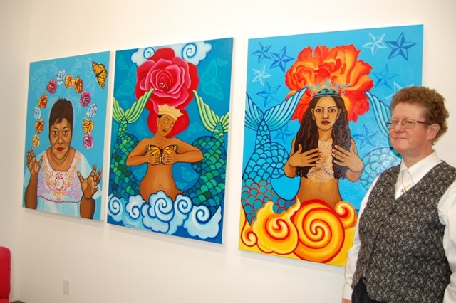 “I believe part of my purpose is to remind myself and others that we are all divine,” Johnson said. She is an African American (biracial) lesbian artist who paints spiritual portraits, primarily women with halos. They gaze into the viewer’s eyes like the saints in Byzantine icons.