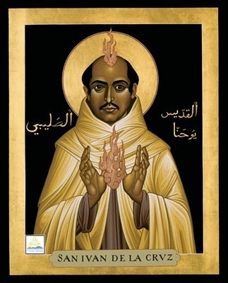 In the icon for this post, Brother Robert Lentz shows John with the living flames that he described in this poetry. The inscription by his head puts his name in Arabic to honor the Arabic heritage that John received from his mother.
