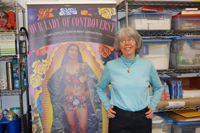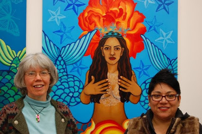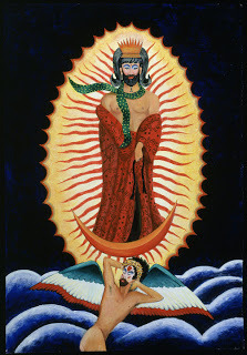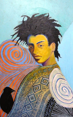 Once again a holy lesbian gazes out at the viewer in Johnson's “Spiral Woman,” but this time she is surrounded with spirals. A black bird sits at her side. “This divine being depicted is shown with a faint halo,” Johnson explained. “Spirals for me represent infinity and change and in the case of the dual spiral emanating from her chest, LOVE. “