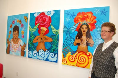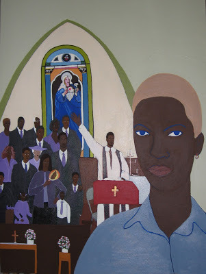 She explores the role of LGBT people in the church with “Inside Out,” pictured above. A woman gazes out at the viewer, stone-faced, with the rest of the church far behind her. A rainbow earring symbolizes her lesbian sexual orientation. The minister raises his arm while the choir and congregation are watching her. She appears to be emotionally and physically distant from the congregation. Her halo is almost invisible. The spiritual lesbian is in the church, but not of the church.
