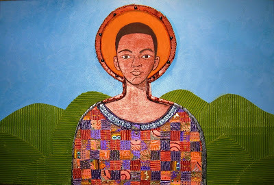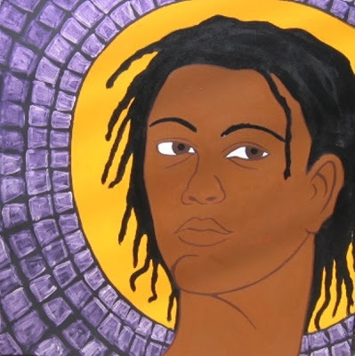 One of Johnson’s most powerful self-portraits is a titled simply “I Am.” An androgynous, brown-skinned figure stares boldly into the eyes of the viewer. Her golden halo glows within a circular mosaic of lavender. The title echoes the name of God in the Hebrew scriptures. When Moses asked the burning bush to reveal God’s name, the answer was: “I am that I am.”