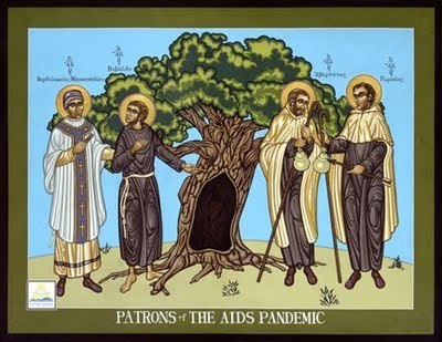 On the left are 13th-century Franciscans who ministered in an Italian leper colony: Blessed Bartolo Buonpedoni and Blessed Vivaldo. Bartolo got leprosy while caring for the sick, so he had to live in segregated housing. His loyal friend Vivaldo moved into the leper house with him, even though he himself did not contract the ailment. They lived together for 20 years until Bartolo’s death. Today there are effective treatments for leprosy, now known as Hansen’s disease. AIDS has taken its place as a dreaded and stigmatized disease.