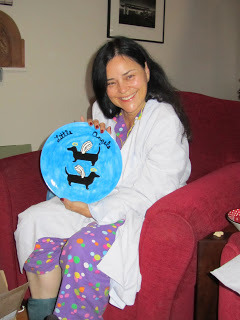 Was rousted at 8 AM to come and open presents (see attached; the plate was the hand-made gift of Elder Daughter), then puttered pleasantly and made lunch--machaca tacos, enchiladas and tamales, all washed down by quantities of Mexican beer. Spent a pleasant afternoon napping, reading, and nibbling, watching everybody watch football, and trying to induce my new iPad to work ("intuitive," my left foot. Technology is one of the things bad language was intended for. Sufficient poking and muttering, though, and I Have Prevailed). Leftover enchiladas, a handful of Dutch chocolate mints, and a sense of quiet bliss reigns.