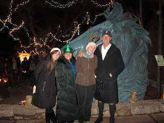 This is a very steep road, lined with art galleries on both sides, about a mile long. And on Christmas Eve, all the galleries festoon their premises with millions (literally) of farolitos (aka luminarias--paper bags with lighted votive candles inside), lighted crimson ristras (clusters of hanging dried chili peppers--though the ones meant for display are often red chili-shaped lights), etc. The whole town (and not a few surrounding settlements) turns out to walk up and down the road, pausing to sing Christmas carols wherever one is breaking out (the occasion is an invitation to anyone who thinks they can play a musical instrument; they stake out a street corner and haul out the old trombone, accordion, fiddle, or ocarina and have a bash at "Old King Wenceslaus") or--if a kilt-wearer (Doug and Iain both went in full kit) to warm one's knees (or dangly bits, as the case may be) over one of the bonfires lit here and there along the street. All very sociable, especially after a few nips, and you get to see your fellow man attired in Just About Anything you can imagine, and quite a few things you wouldn't dream about after a late lobster supper with horseradish.