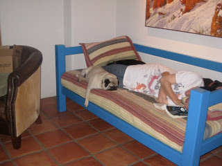 (That's Otis in the foreground, there--my son's pug; the two black lumps just visible behind me are Homer and JJ. Charlie--son's corgi--doesn't like to get on the couch, and a good thing, too; he's under it.)
