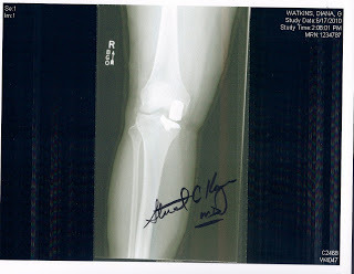 OK—this is what it looks like on the inside. Just had my post-surgery checkup—all well—and the surgeon kindly presented me with a souvenir X-ray of my right leg, with unicompartmental knee in place. [g:] (This is, if I'm not mistaken, a back view of my right leg (taken while I was unconscious following surgery). I _think_ that they flipped the negative while making the copy, thus making it look like my left leg.)