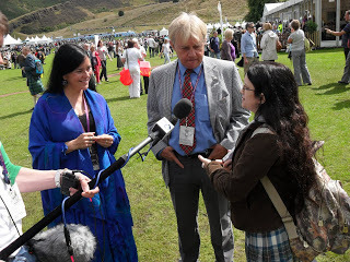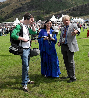 Frazer Hines (the actor who played Jamie MacCrimmon, a companion to the second Doctor, on "Dr. Who") sent me these photos this morning—they were taken last summer in Edinburgh (by a nice journalist named Jean Brittain—thanks, Jean!) while I was appearing at the Gathering there. You can't see any of it, alas, but we're on the grounds of Holyrood Palace here, talking with fans who'd come to my reading.