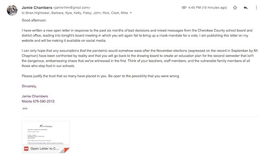 In July I sent you all a letter detailing my opinion—shared by many parents in our district and more than a few of your own employees—that your plan for reopening Cherokee County schools was completely insufficient in attempts to mitigate the spread of the coronavirus. In the six months that have passed I’ve watched in horror and shame as you continue to mismanage this situation to the detriment of your own teachers and the families in our community. You ignored the death of a CCSD employee from Covid-19 over the summer just as you publicly ignored the middle school teacher who was recently hospitalized with the disease. You’ve had to close schools multiple times due to an overwhelming number of cases and our district experiences hundreds or more quarantines a week despite your best efforts to isolate as few people as possible.