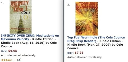 October 5, 2010, K-Bomb Centcom, Los Angeles, CA—In what is arguably a drag-strip journalism first, both Cole Coonce's Top Fuel Wormhole (his collection of drag racing essays), and its predecessor, Infinity Over Zero (an impressionistic history of the Land Speed Record), have both gone electric. Which is to say these may or may not be the first books on the topics to have a presence on Amazon.com's Kindle store, but, arguably, these are the first essential ones.