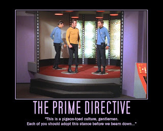 I've been thinking about the Prime Directive lately. For those of you who aren't regular viewers of Star Trek, it's a science fiction TV series set 300 years in the future. In the show there is a U.N. type group called the Federation that governs the activities of the intelligent beings on various planets throughout the galaxy who have developed space travel and enjoy exploring other planets. The Prime Directive is the Federation's law that says that none of these explorers must make contact with, or give advanced technical knowledge to planets whose inhabitants aren't sufficiently developed socially to handle such contact or such technology.