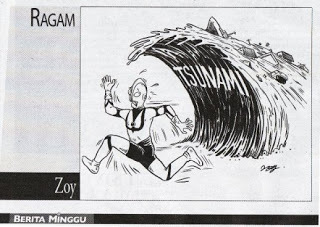 Finally, here is a cartoon that appeared in a Malaysian newspaper on Monday prompting a lot of people to get very upset. The newspaper issued an apology. That's our old pal Ultraman running away from the tsunami. Ultraman is a well-known symbol of Japan all over Asia.