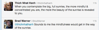 I follow Thich Nhat Hanh on Twitter. But, whereas I write my own Twitter posts, I doubt that Mr. Hanh sits in front of his Macbook and types his out for the world to see. My guess is that some minion of his scans his books for pithy statements that fit the Twitter mold and then uploads them. The Thichster probably never even sees them. I rarely see them either. But yesterday this one popped up: