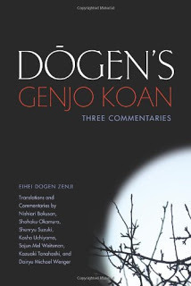 Anyway, that's not what's going on with Dogen's Genjo Koan: Three Commentaries. So just forget I said any of that stuff. The reason there are so many authors in this book is because it is a compilation of three commentaries, each of which has two or three authors or editors attached. The first is by Nishiari Bokusan, who was the teacher of Shunryu Suzuki's teacher Kishizawa Ian. This is translated by Kazuaki Tanahashi and Mel Weitsman. Tanahashi is Japanese and speaks English but is not an ordained Zen teacher. Weitsman is American and does not speak Japanese but is an ordained Zen teacher. So one can guess that Tanahashi is responsible for the actual translation into English while Weitsman made it sound more Zen and that the two of them hashed out the translation to make sure the final piece was true to the original. Though I can't help wondering if they also removed any offending sexism or suchlike in the process.