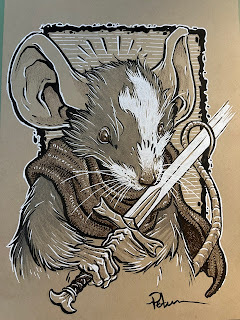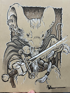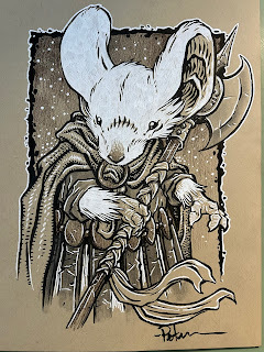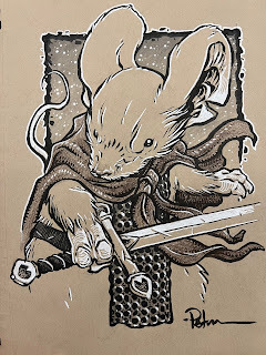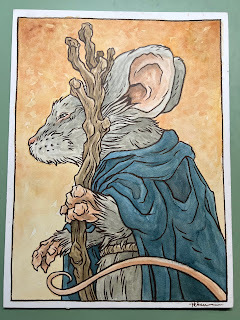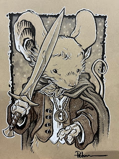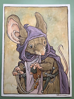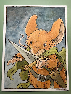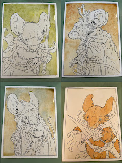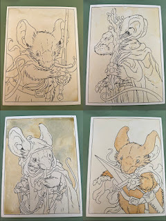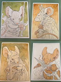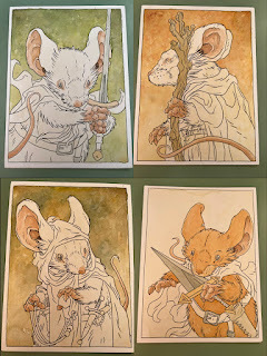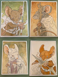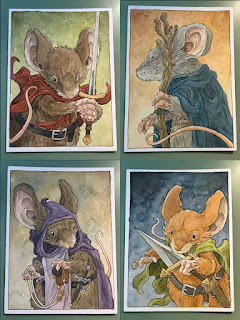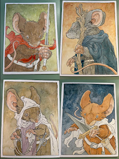 In anticipation for SDCC 2023, I painted four Mouse Guard watercolor portraits of Saxon, Kenzie, Sadie, & Lieam. I had some cut-offs from trimming down the boards from my large HeroesCon watercolors of the Gummi Bears & Ducktales (http://davidpetersen.blogspot.com/2023/06/heroes-con-2023-paintings.html).