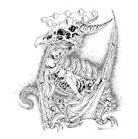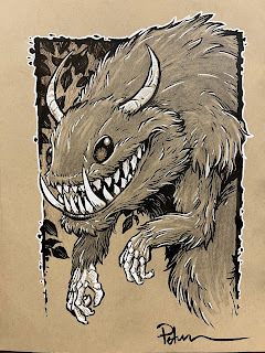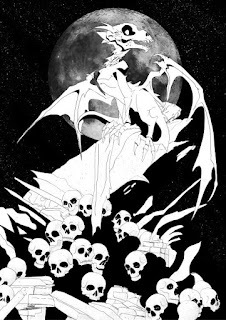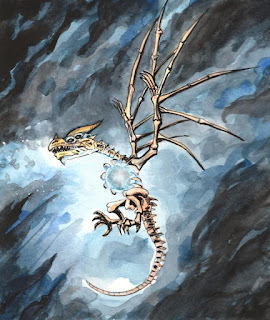 The printout was taped it to the back of a sheet of Strathmore 300 series bristol. Using a lightpad, I was able to see through the surface of the bristol as I inked the dragon. I used Copic Multiliner 0.7 SP pen to ink the art. Most of the inking was straight forward other than the on-the-spot line weights and contours that imply more form and planes to the bones. I also wanted to play with the idea of this dragon glowing a bit, but also letting off some darkness (like the Balrog being a creature of smoke and shadow--but also flame). So, on the back of the bristol I stippled in a darkness aura around the creature while leaving a little air gap around it.