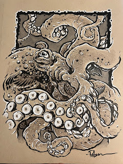 I printed the above digitally assembled layout onto two sheets of legal sized paper (taping them together so the image was 11" x 11") and then taped them with painter's tape onto the bak of a sheet of Strathmore 300 series Bristol.On my Huion Lightpapd I was able to see through the surface of the bristol down to the printout and use it as my 'pencils' as I worked. I used Copic Multiliner SP pens (the 0.3 & 0.7 nibs).