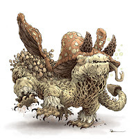 I had several mis-starts (not pictured) of mushroom shapes with toothy mouths like The Bolete of Coliandre's. I then saw a photo of a Komodo Dragon in my 'dragon' search bar and it lead to the pencils you see on the left. It's pencil on copy paper, incorporating fly agaric caps, morel pores, enokis, and mushroom gills. On a separate sheet of copy paper I drew the 'wings' and then assembled the two drawings together in Photoshop and added in flat colors just to help me see the forms and know where certain textures would begin and end.