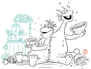 It was a fairly basic color palette I'd already established in the pencils/layout. This piece had very few color holds (areas where I want the line art to be a color other than black) only on the pupils and the roots coming off the pads of the feet.