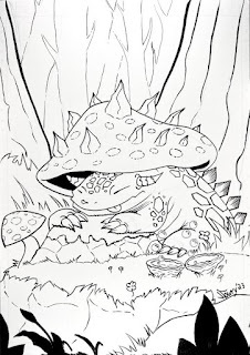 The printout was taped it to the back of a sheet of Strathmore 300 series bristol. Using a lightpad, I was able to see through the surface of the bristol as I inked the dragon. I used Copic Multiliner 0.7 SP pen to ink the art. The texture of the morel pores was where I dove in and had the most fun. I was certainly inspired by the textures of my friend Nate Pride's ink work. The rest of the linework was my normal thick/thin line weights and varying densities of detail.