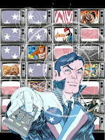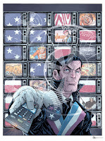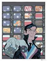 Layout: I wasn't terribly familiar with the characters from these creator-owned series, but I had seen some Nexus & American Flagg comics. Knowing Steve Rude's Nexus would be getting a lot of love, I decided to go for American Flagg. I did my research about the Sci-fi political satire nature of the comic and how important TVs and messaging (subliminal hypnosis) was in it. So I drew Reuben Flagg with a TV remote pushing a 1First Comics button. The rest of the layout was just an assembly of stock photos of TVs, a flag, a cat, static, and covers from the various other 1First comics being celebrated in the Yearbook.Wanting to get a James Bond feel to the piece, I thought it would be fun to place a sniper's scope crosshairs over Flagg––but instead make it an old TV test pattern. The only thing I really drew was Flagg himself, and I certainly used photo reference for the hand and remote.