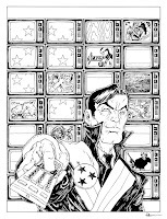 Inks: When I was satisfied with the above layout, I printed it out (without the test pattern) and taped it to the back of a sheet of Strathmore 300 series 14" x 17" bristol. On my Huion lightpad I was able to see the printout through the bristol and ink without transferring pencils to the board.Inking the TV cases over and over got a bit tedious, and Reuben was so big, he was easy. The hardest part was inking in all the homages to the other 1First covers at that tiny scale. I tried to just be loose since it was all an interpretation being displayed on a screen anyhow.