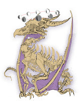 I knew from the start I wanted a dragon that had the stance of a walking pterosaur. So, I started with that body drawing. I didn't leave quite enough room on the sheet of copy paper for the head, so I drew it separately on another sheet (referencing bird skulls, but adding more possible eye sockets).Somewhere in there my concept of a halo of moons in their phases (with the skull lighting them like a sun) it dawned on me that those moons could also serve as the many eyes.