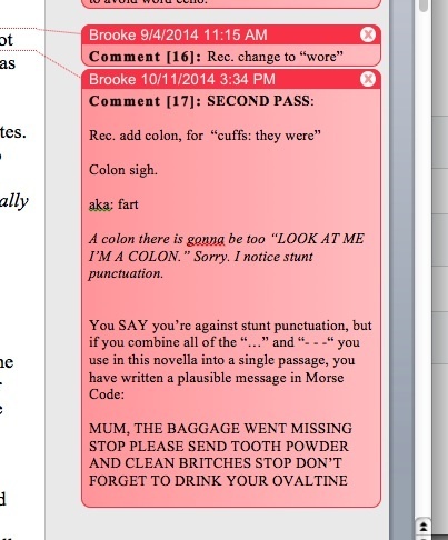 Got the last draft of Seventh Bride back and am going through now. The comments my editor leaves in the sidebar are a thing of glory forever.