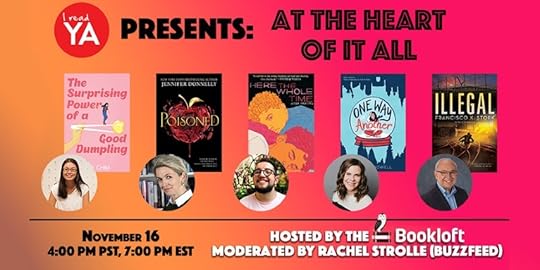 I READ YA presents: At the Heart of It All, a YouTube live panel discussion on new books with heart by Jennifer, Wai Chim (The Surprising Power of a Good Dumpling), Here the Whole Time (Vitor Martins), One Way or Another (Kara McDowell) and Illegal (Francisco X. Stork). Moderated by Buzzfeed’s Rachel Strolle and hosted by The Bookloft.