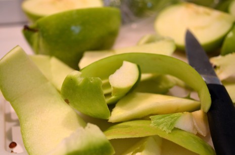 In the meantime, peel 3# baking apples. Granny Smith are a reliable choice here, but Jonathans, Jonagolds, Winesap, or any apple that bakes well will work. Mix 1 cup of sugar with one teaspoon of cinnamon in a small bowl and set aside. In a saucepan, brown a cup of fine bread crumbs in 3/4 c. butter. Set aside. Melt another 3/4 c. butter and set aside.