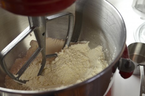Mix 3 T. oil, 1 large egg, and 1 t. salt in a small bowl. Put 3 cups all purpose flour into the bowl of your Kitchen Aid. (I am confident that if Millie Paisoli and Frances Zibert had a Kitchen Aid, they would have used it. As it was, they recommend beating vigorously with a wooden spoon for 5-7 minutes, followed by kneading for 15. See what I mean?)